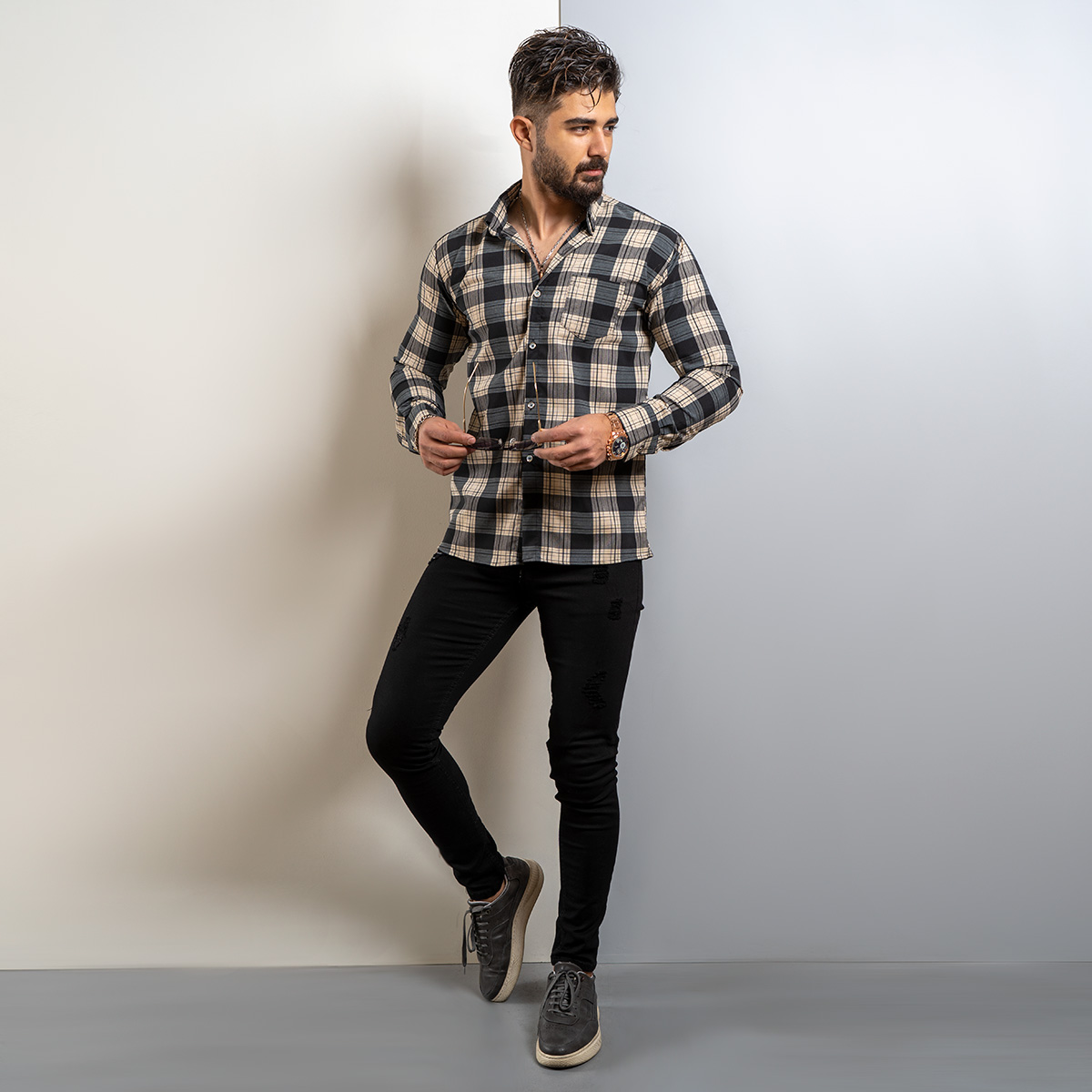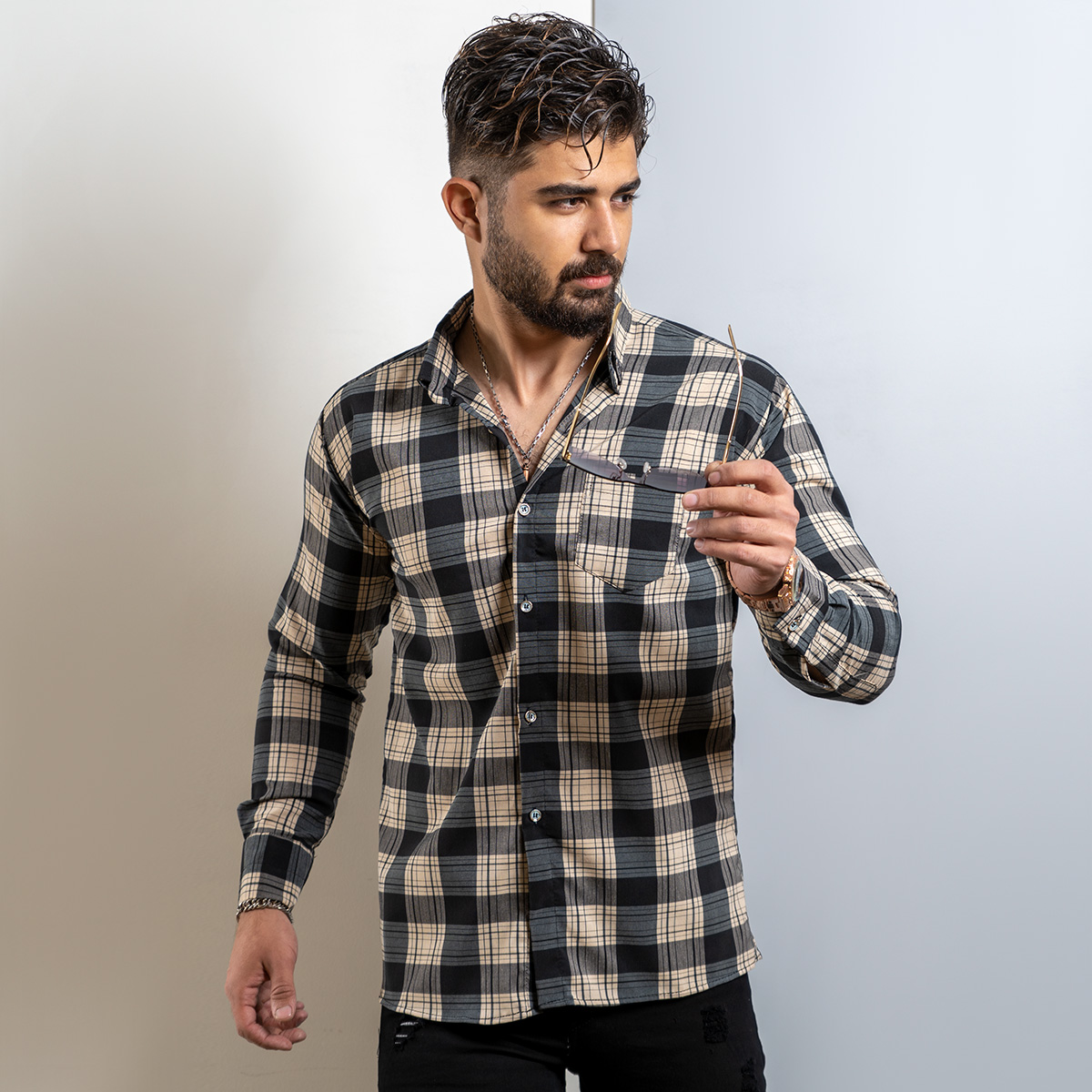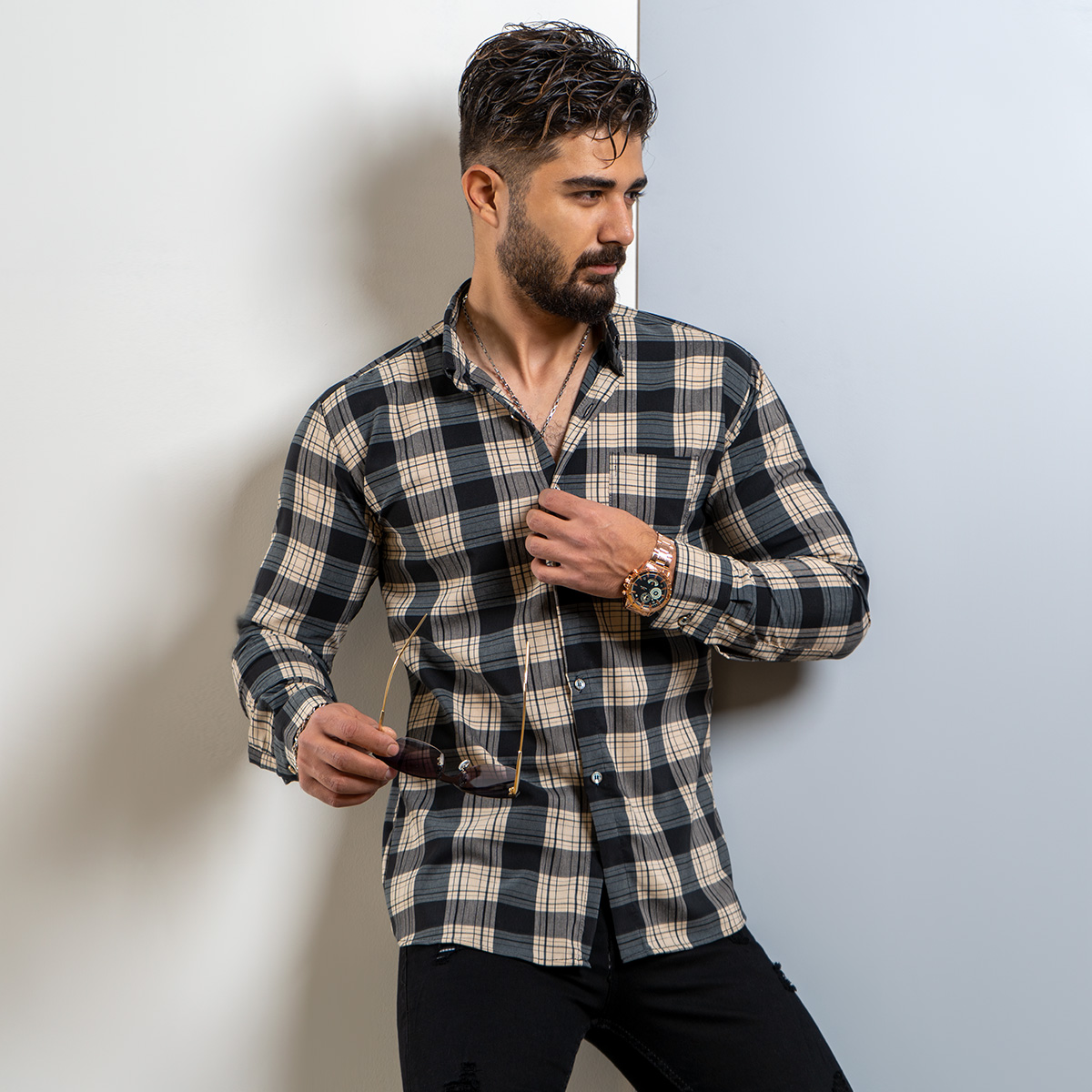 پیراهن چهارخونه کرم طوسی مردانه مدل amir