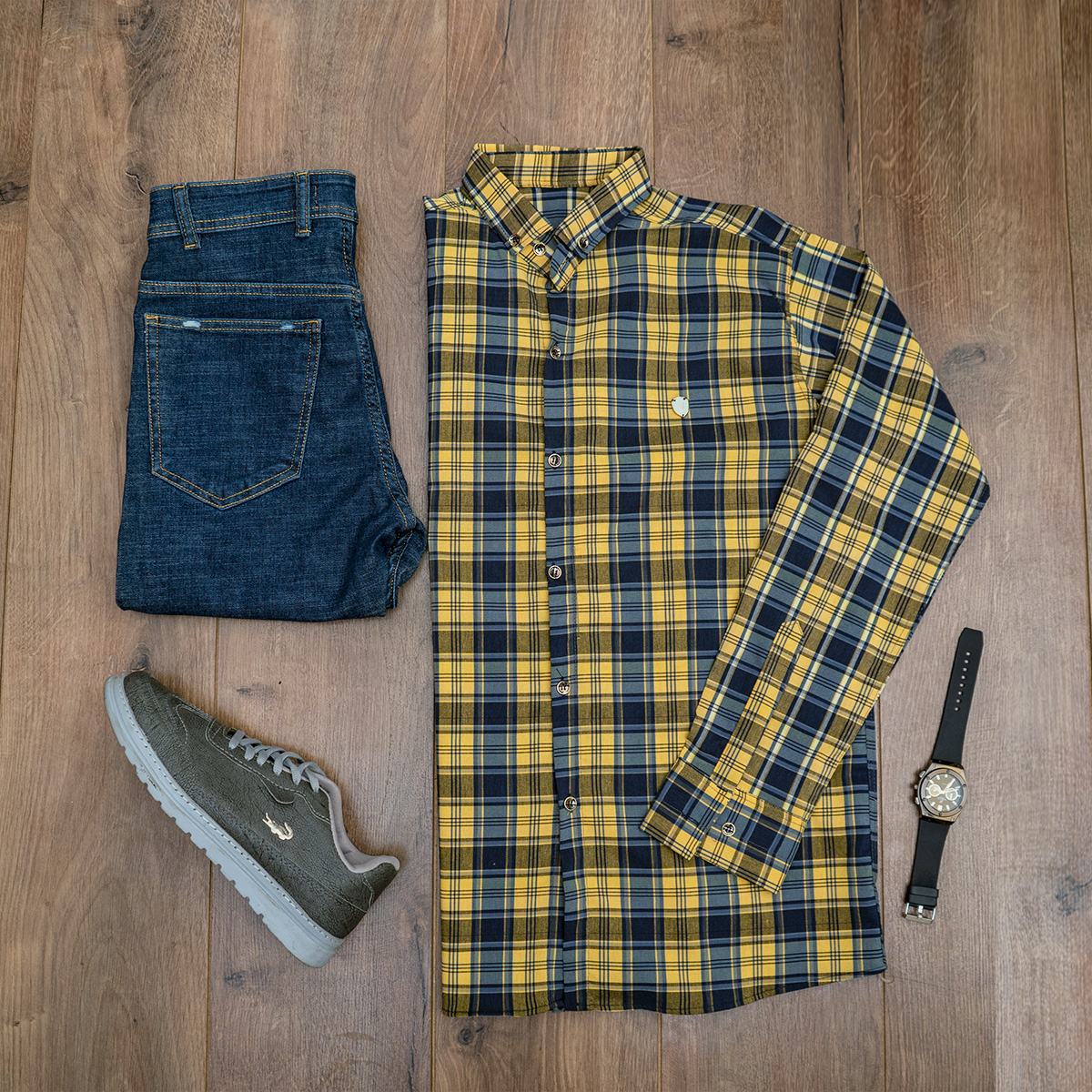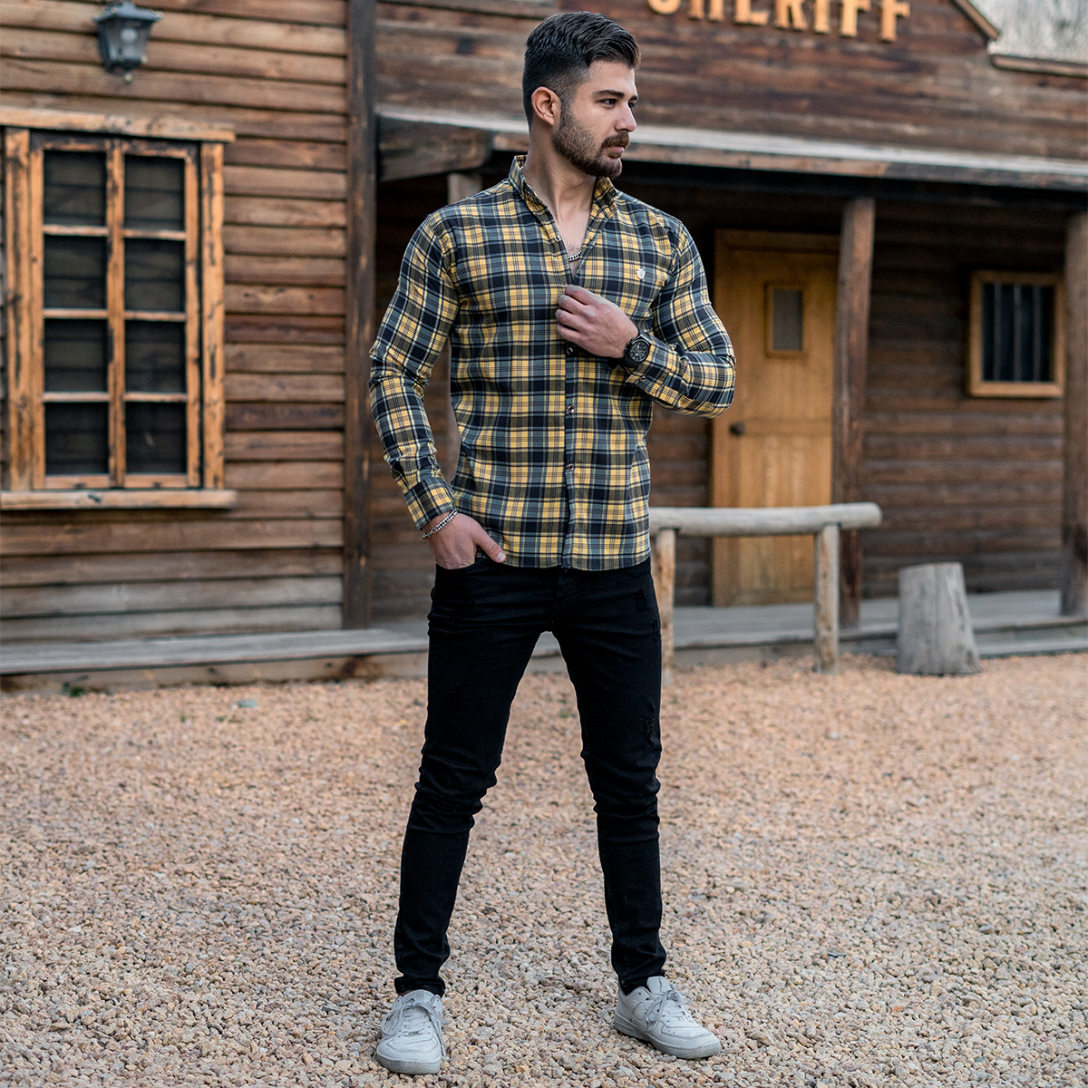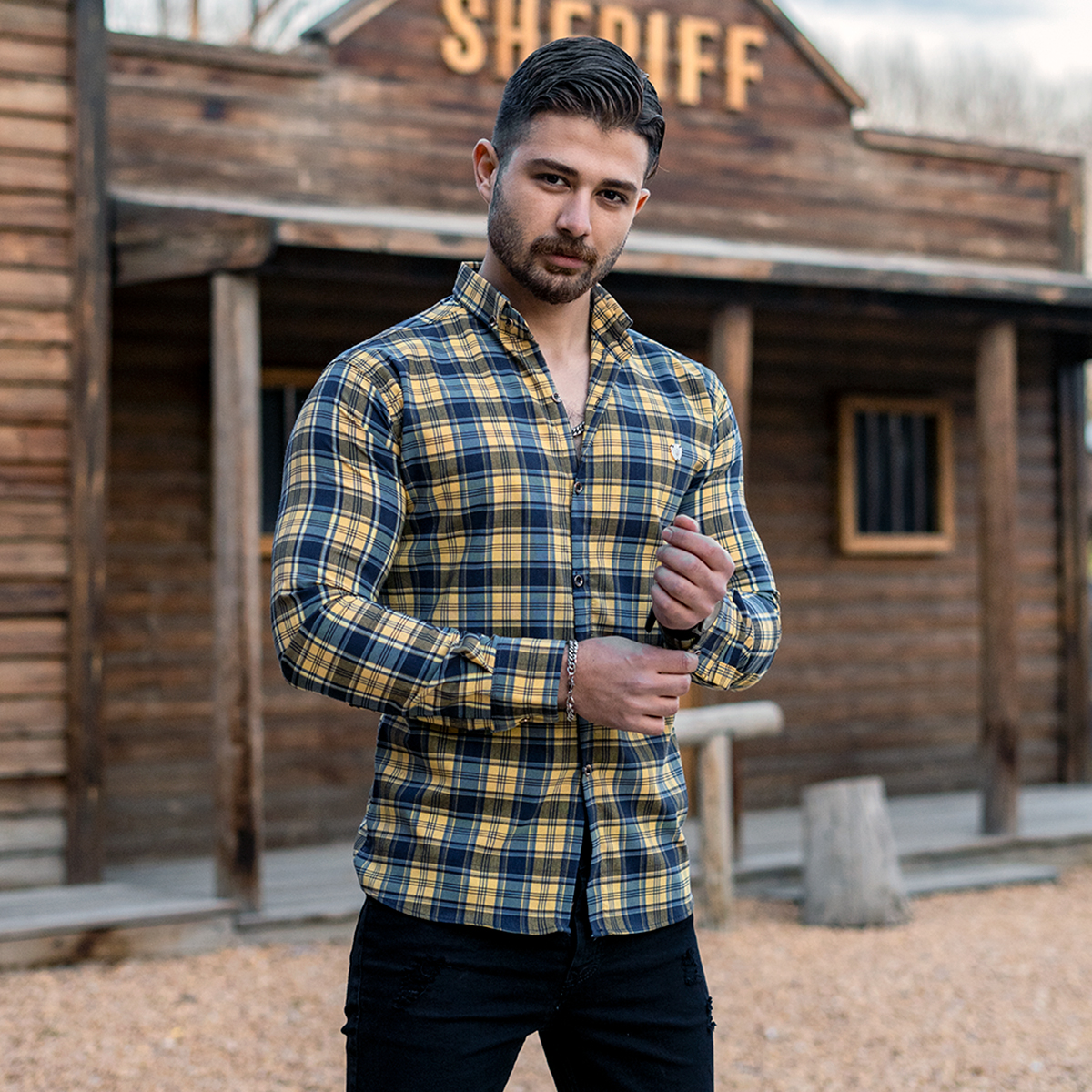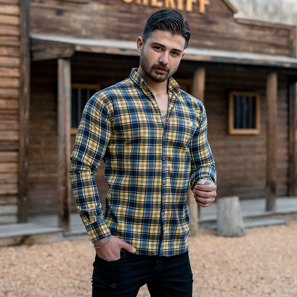 پیراهن چهارخونه سرمه ای زرد مردانه مدل katin