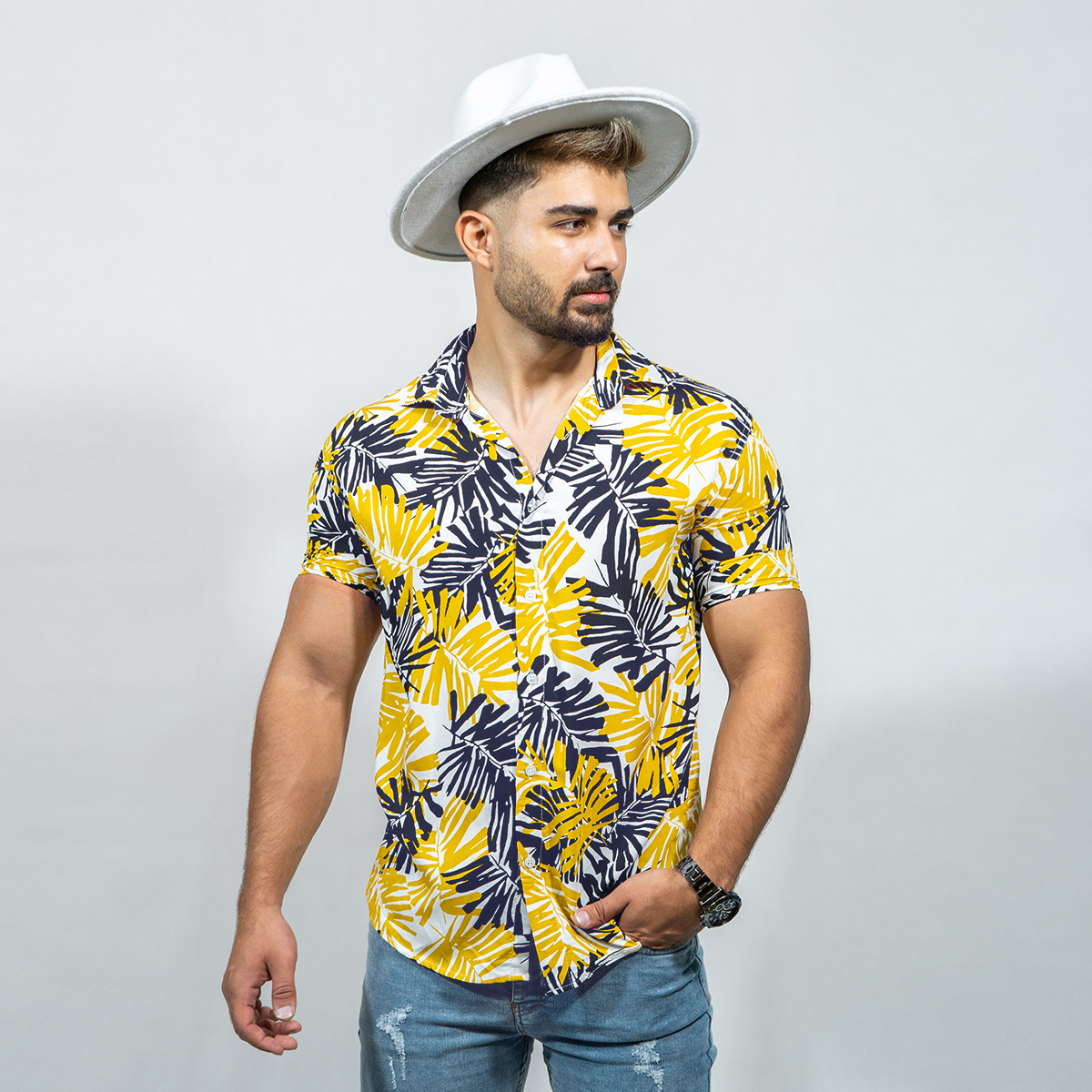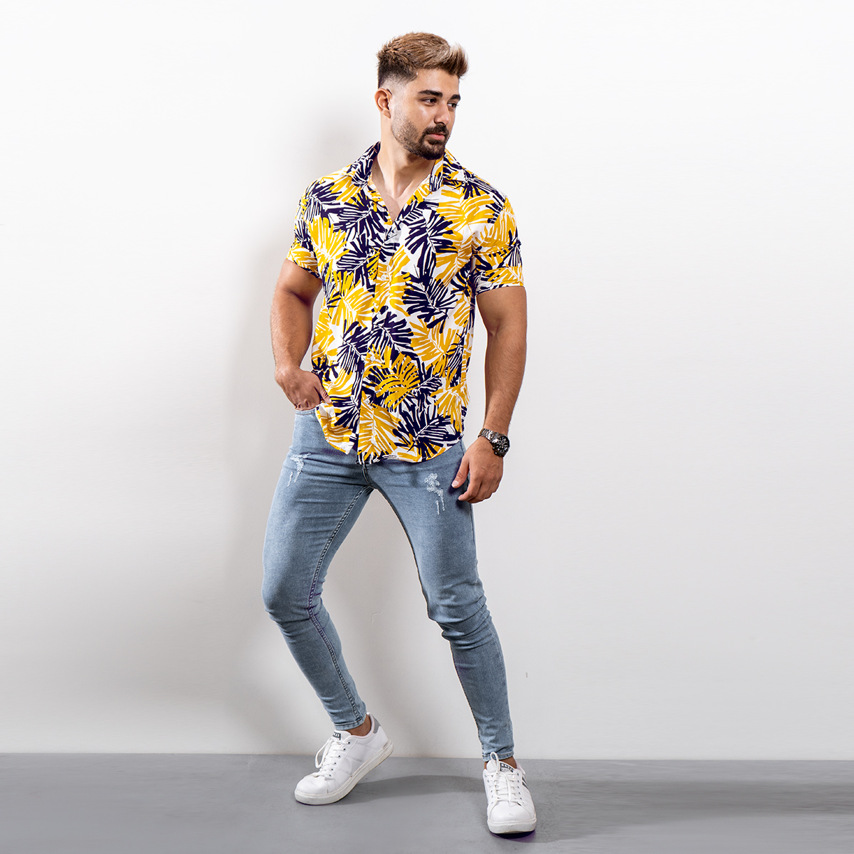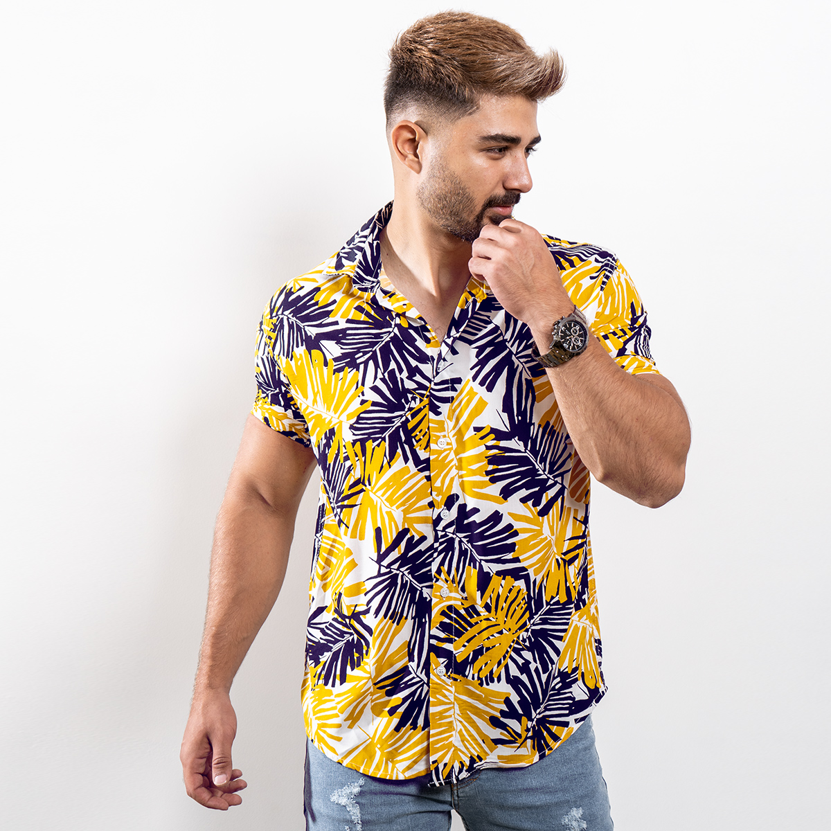 پیراهن هاوایی زرد مردانه مدل Hogo